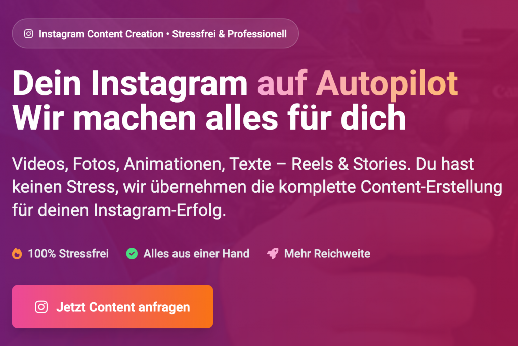 Videos, Fotos Animationen, Texte – Reels § Stories. Du hast keinen Stress, wir übernehmen die komplette Vontent-Erstellung für DeinennInstagram Erfolg.